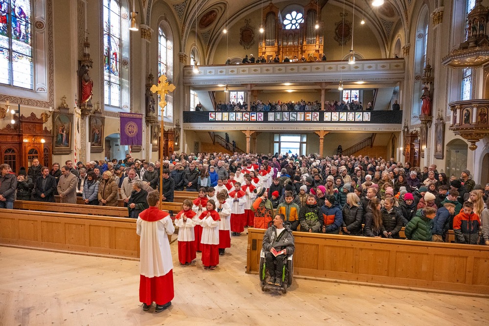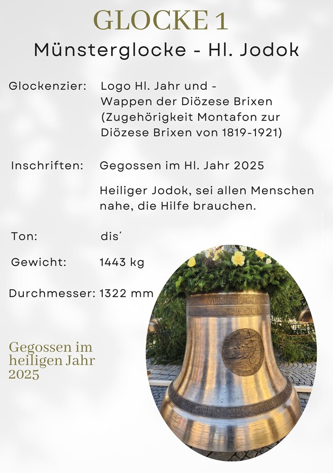 Nach der Weihe zogen Ministranten:innen, Trachtenträger:innen und alle Gläubigen gemeinsam mit dem Bischof und den Priestern in das Münster Schruns ein, wo ein festlicher Gottesdienst gefeiert wurde. Dieser stand nicht nur im Zeichen der Glockenweihe, sondern auch des Patroziniums für den Hl. Jodok, und wurde musikalisch eindrucksvoll vom Kirchenchor Schruns gestaltet, der mit festlichen Klängen zur besonderen Atmosphäre beitrug.