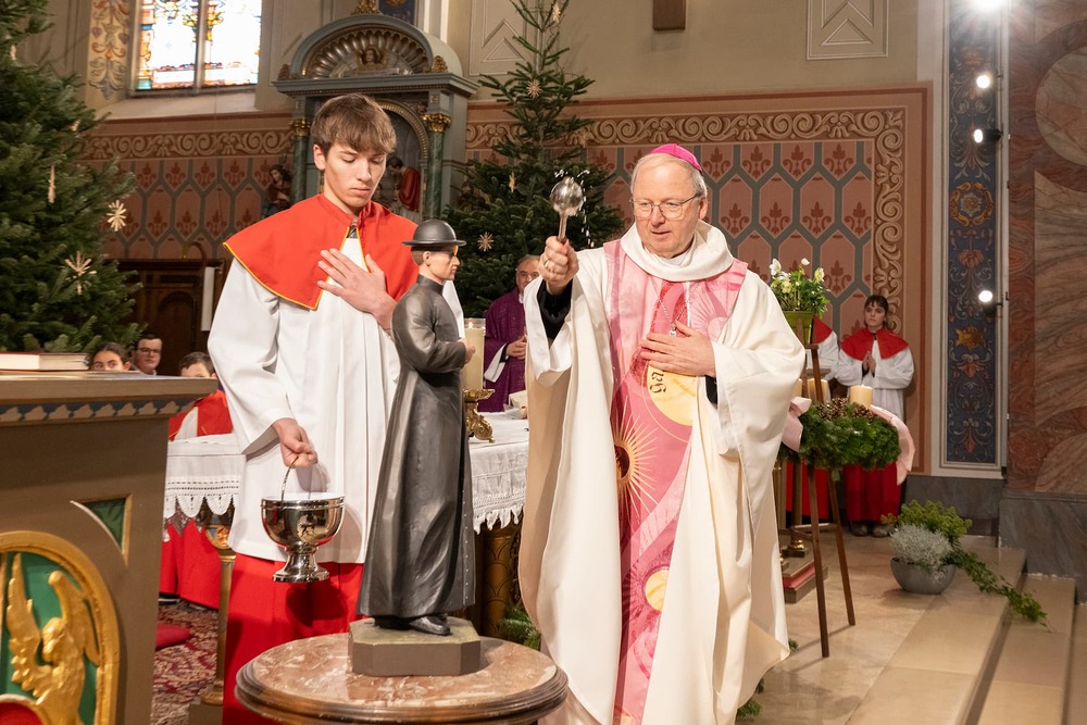 Ein besonderes Highlight war die Enthüllung und Weihe der eigens für die Pfarre angefertigte Statue vom Sel. Pfarrer Carl Lampert. Damit wurde ein Zeichen des Gedenkens und der Verbundenheit gesetzt. Zum Abschluss der Feierlichkeiten wurde Bischof Benno besonders überrascht: er wurde für die Verleihung des Münsterpreises auserwählt, als Dank und Wertschätzung für seinen unermüdlichen Einsatz für die Kirche und seinen Dienst für die Einheit unserer Gemeinschaft. Die „Schrunser Münsterzwiebel“ wird zum ersten Mal an Persönlichkeiten verliehen, die sich in außergewöhnlicher Weise um Kirche, Gemeinschaft und Glauben verdient gemacht haben. Die feierliche Überreichung findet am 8. März 2026 im Rahmen des Gottesdienstes statt.